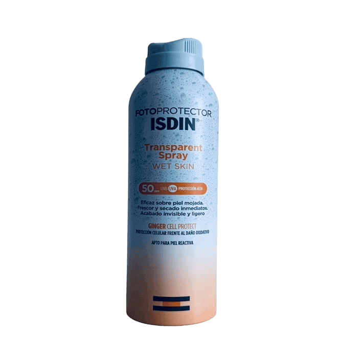 Fotoprotector ISDIN transparent spray. Protector solar. Protección UVB y UVA. Protección alta. FPS (Factor de Protección Solar). Fotoprotector en spray transparente, fresco y de secado inmediato. Wet skin. Resistente al agua. Con Ginger Cell que estimula la defensa natural de la piel contra el daño solar.